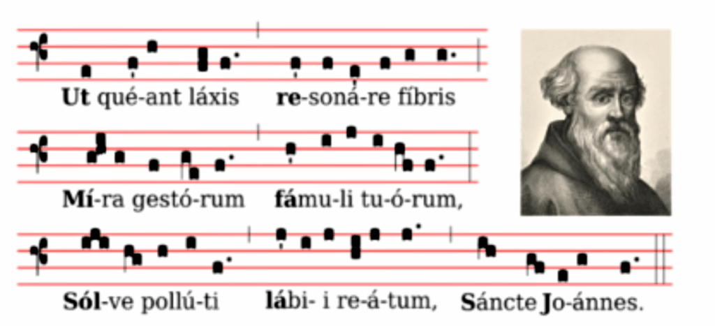 Las notas fueron originadas en las primeras décadas del siglo XI, cuando el monje benedictino Guido d’Arezzo, el cual era considerado el padre de la música en la edad media, utilizó un himno que se solía cantar en las vísperas de la celebración de San Juan Bautista, titulado “Ut queant laxis”; este himno fue utilizado debido a que en la primera sílaba de cada verso recae en un tono diferente hexacordo (los primeros seis tonos de la escala mayor); estas sílabas, Ut, Re, Mi, Fa, Sol y La; De las cuales más adelante el nombre de algunas notas fueron cambiados como por ejemplo la nota Ut se conoce actualmente como la nota Do, (esto por Dominus o Señor, aunque tambien esta la teoria que su nombre se dió por el cantante italiano Giovanni Battista Doni), la razón principal de éste cambio fue que la utilización de una sílaba acabada en vocal favorecía que pudiese cantar mejor. Adicional, en las notas principales D’Arezzo no quiso dar nombre a la séptima nota siguiendo la tradición, ya que se consideraba el Si como un tono diabólico, por lo cuál el Si no tenía altura fija y a veces le llamaba “Be mollis”, fue hasta el siglo XVI cuando se añadió la nota musical Si, derivado de las primeras letras de San Juan (Sancte Ioannes), también en este proceso se perfeccionó la escritura musical con la introducción definitiva de líneas horizontales que fijaron alturas de sonido, cercano a nuestro sistema actual, se añadió una quinta línea a las cuatro que se utilizaban para escribir música y se llegó a la forma en que hoy la conocemos, llamada pentagrama.